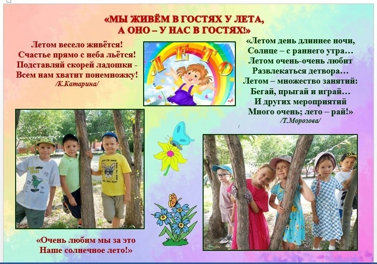 Это удивительная и благодатная пора, когда детям можно вдоволь гулять, бегать и прыгать. Каждый летний день приносит ребятишкам что-то новое, наполнен интересным содержанием, чтобы воспоминания о летнем времени, играх, прогулках, праздниках и развлечениях ещё долго радовали детей.